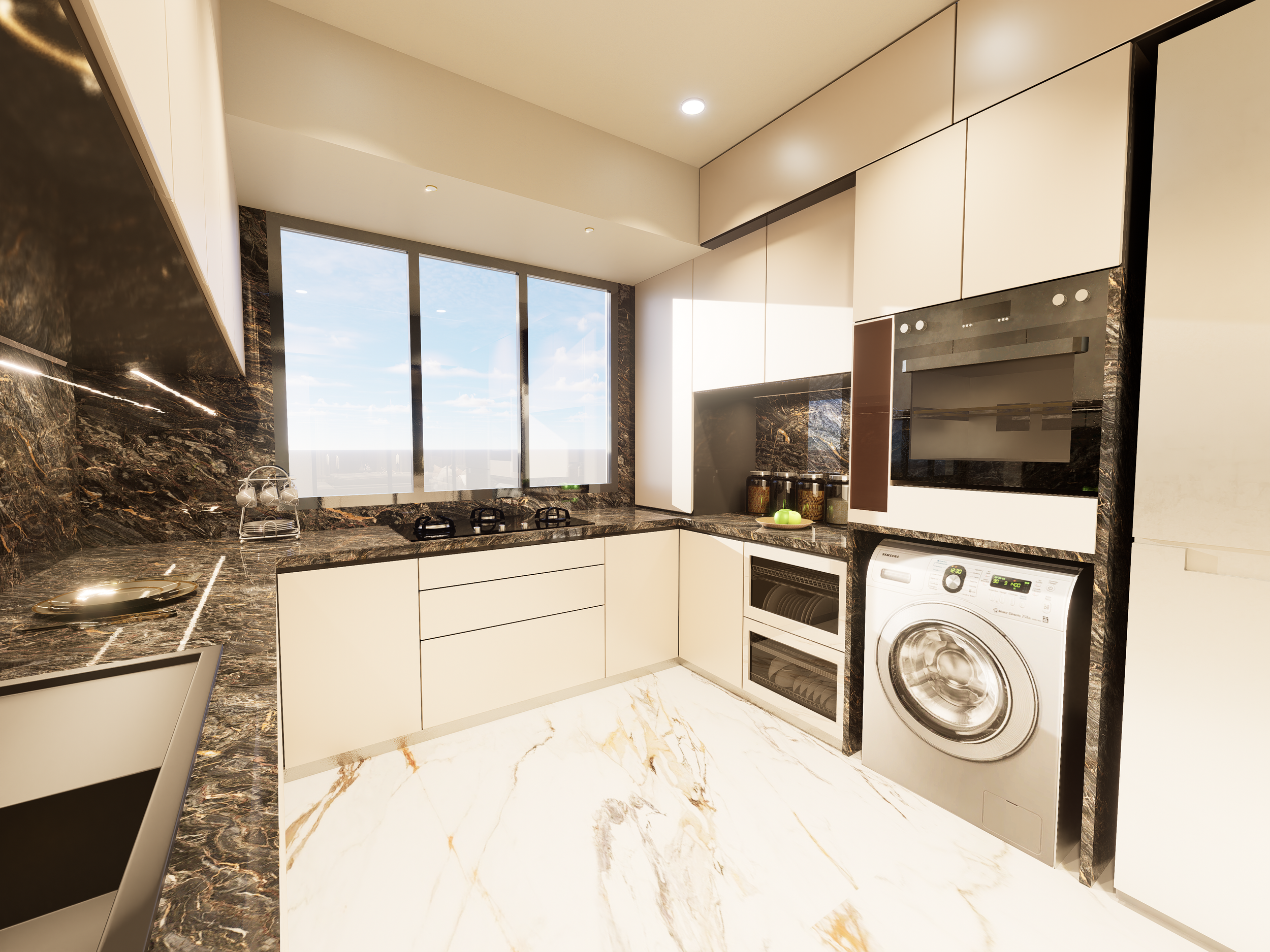 The kitchen embodies sleek functionality with a muted cream and espresso marble palette. High-gloss handleless cabinetry enhances modernity, while deep veined dark marble for countertops and backsplash adds dramatic flair. Built-in appliances integrate seamlessly, maximising utility without compromising aesthetic. The result is a culinary space that feels polished, efficient, and indulgent – a testament to Studio Redefine’s pursuit of timeless luxury interiors.
